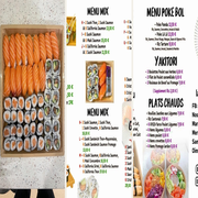 Le menu propose une variété de sushis, makis et plats à partager. Les participants peuvent choisir des plats allant des makis saumon aux rolls surimi avocat. Les portions sont généreuses et conçues pour plaire à tous. En plus, des options de boissons, y compris des cocktails et du vin, complètent le repas.